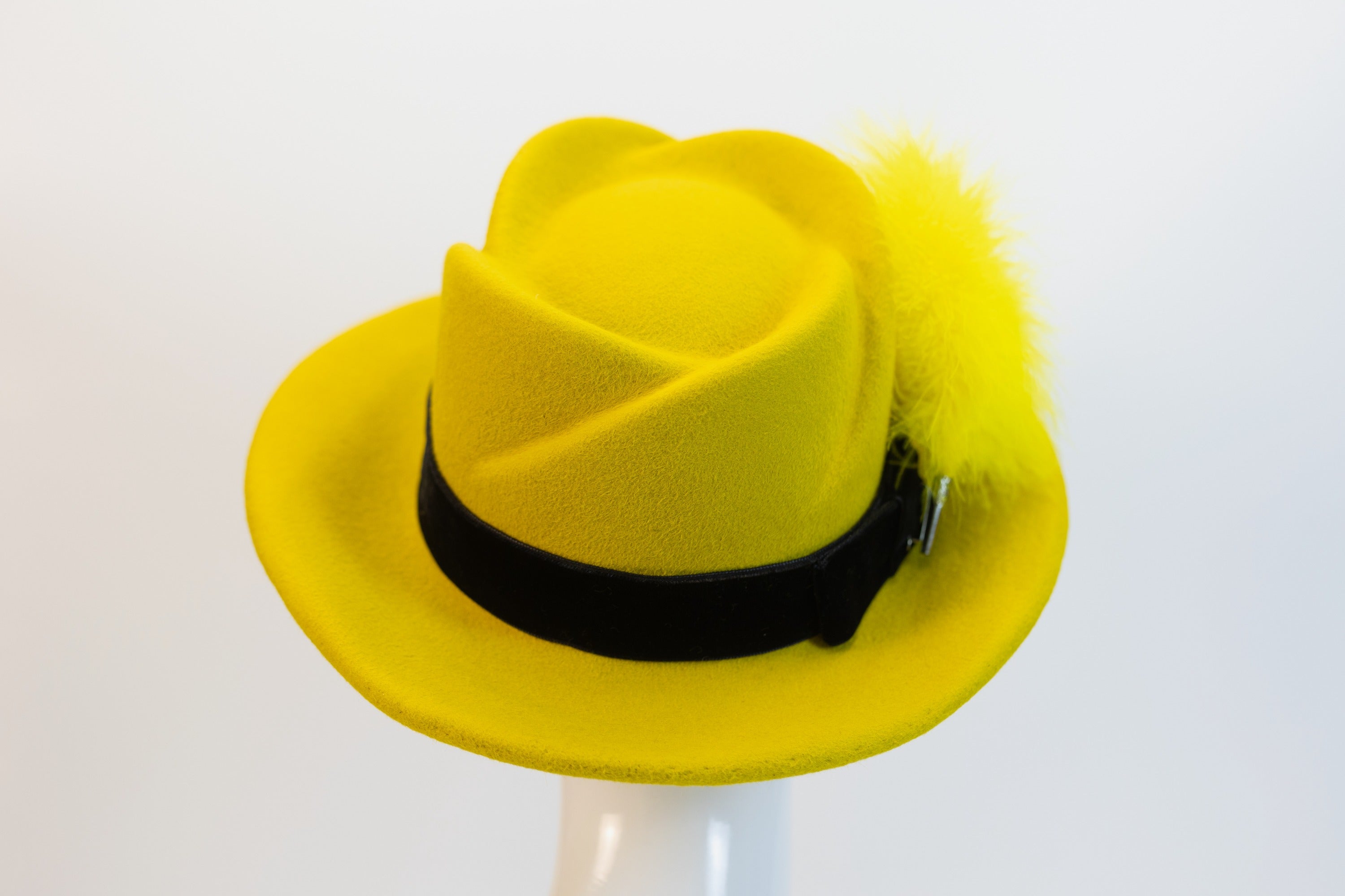 Emma represents a refined approach to millinery design, combining luxurious yellow velor Capellini with understated sophistication. The piece features a refined black French velor ribbon and striking yellow pin feather detailing that elevates any occasion. Whether worn at formal events or as a distinctive everyday accessory, this hat demonstrates masterful construction and meticulous finishing throughout. The harmonious interplay of textures and color creates a versatile statement piece that complements both classic and contemporary wardrobes with quiet confidence.